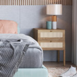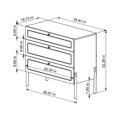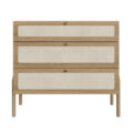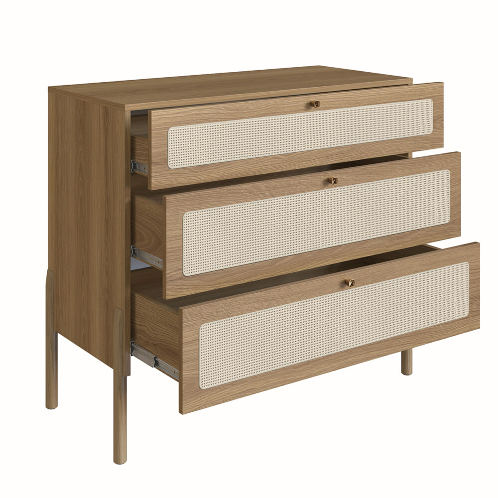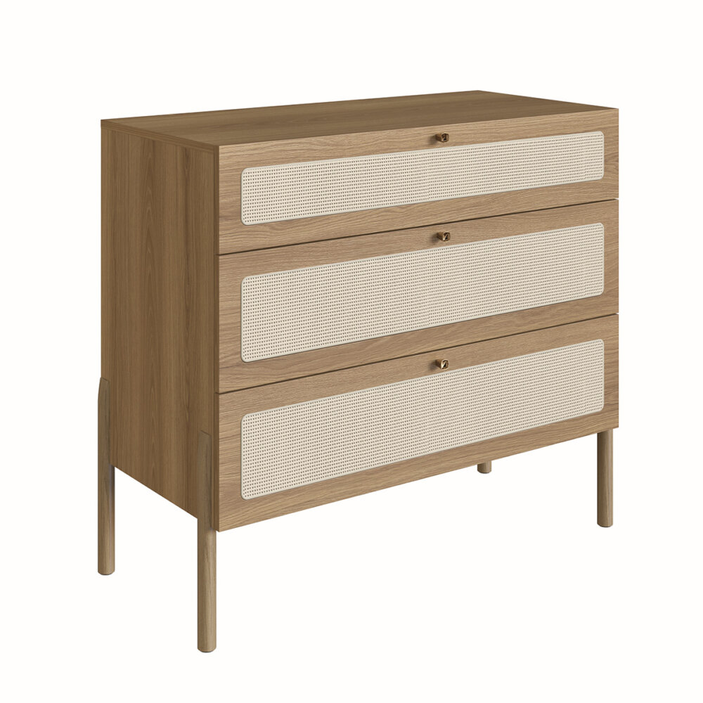 3-drawer chest produced in MDP with low-pressure (BP) melamine coating, solid wood legs and synthetic rattan insert on the drawers, and golden polystyrene handle. Rollover safety system, handmade, soft and cozy touch. Straight lines, minimalist design and a soft color palette, which provide elegance and sophistication.