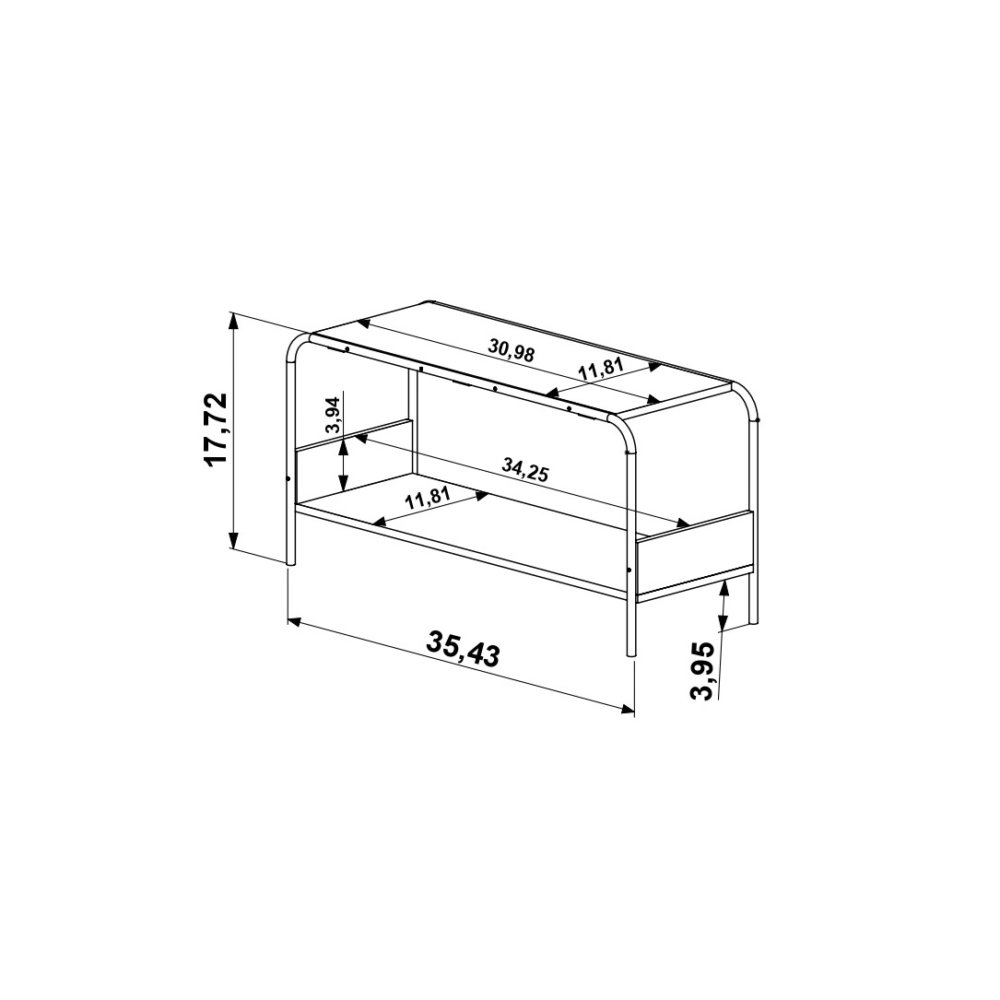 Shoe cabinet bench made of 15mm thick MDP parts with LP laminate. Structure: round carbon steel tube with a 15-mm diameter, matte black epoxy and anti-corrosion coating. Maximum weight capacity: 155 lb on the top and 15 lb on the shelf.