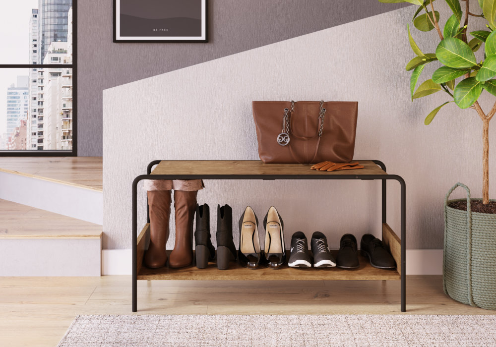 Who said storage can’t be stylish? This shoe storage bench showcases a sleek design with an open metal frame that complements the wooden shelf and top. The bottom shelf can hold a total of six pairs of shoes or boots, thanks to its height, making it a great addition to your mudroom, bedroom, or entryway. With a simple and attractive design, it is also ideal for stowing bags, boxes, books, plants, etc. and thanks to its neutral hues and compact silhouette, fits easily in any space.