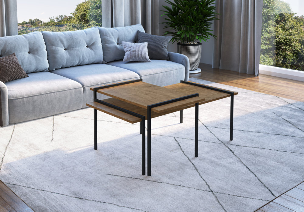 Table set with 2 coffee tables made of 15mm thick top. 15x15mm steel metal frame, epoxy paint finish.
