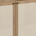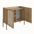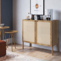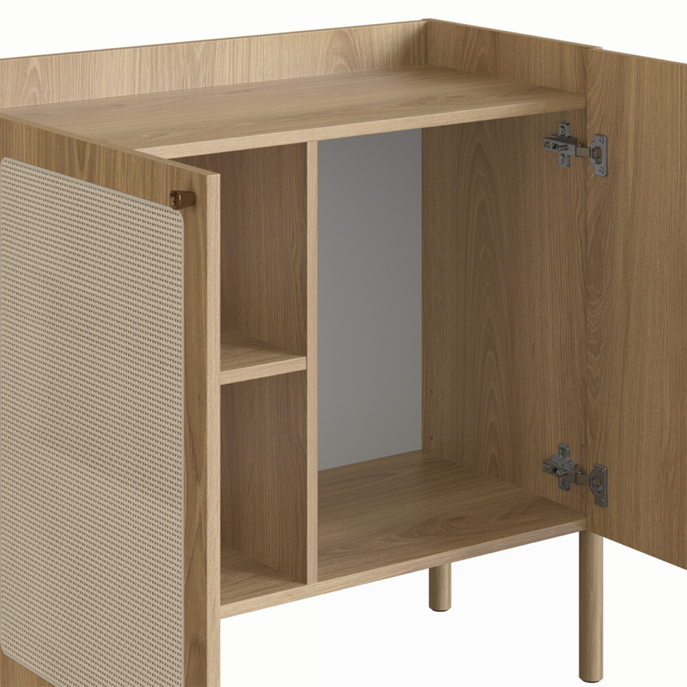 This 2-door accent cabinet, with a clean-line silhouette, streamlines your space with a natural appearance and plenty of storage. Crafted from solid and manufactured wood, it will add a hint of contemporary aesthetic to your kitchen, dining or living room. The synthetic rattan doors, in addition to giving it an organic touch, are highly resistant and will withstand the passage of time. When open, they reveal three interior shelves ideal for dishes, linens, glassware or anything you need organized. The natural and organic palette blends in seamlessly with any color scheme or style, becoming a perfect addition to your house.