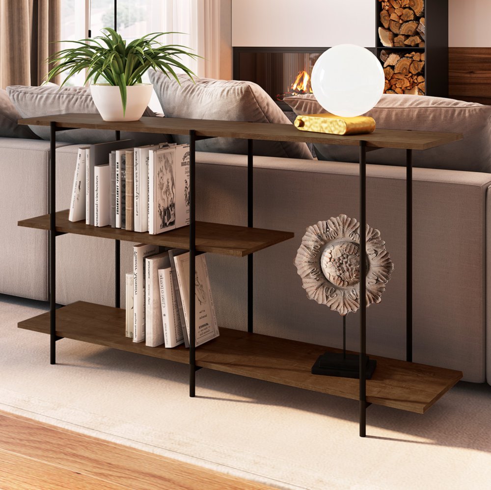 Cause an impact right at the entrance of your home, or turn your living room into a more visually attractive and organized space with the help of the modern Martinho Console. The structure is made of steel tube in black color, in combination with manufactured wood, giving it a trendy, industrial appearance. The half-height shelf adds a unique touch and is ideal for decorative accents or items you need at hand, while the bottom and top shelves leave plenty of room for books, family photos, lamps, or any other must-have items.