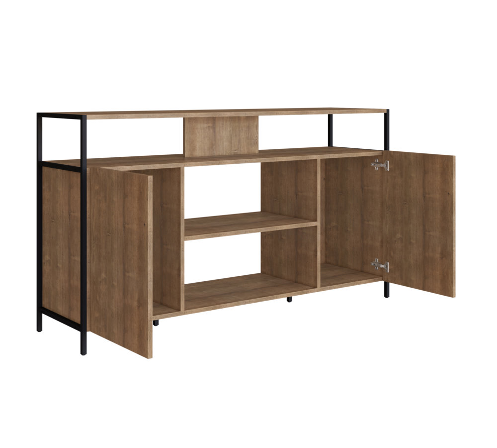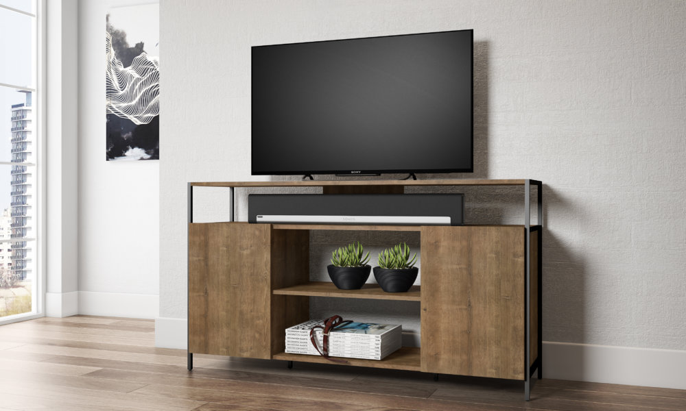 Embolden the character of you living room or bed room with this awesome TV stand. Crafted from manufactured wood, this striking piece is constructed from sturdy wood and metal accents. The 2 open shelves are a convenient display for media devices or décor, while 2 additional shelves behind the doors offer storage space for everything you don’t wan’t in sight. The metal accents lend a cool, industrial feel to your home, without sacrificing functionality.